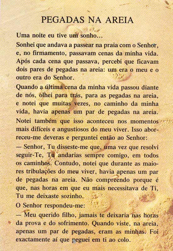 "Herr, Du sagtest mir, dass, nachdem ich beschlossen hätte, Dir zu folgen, Du immer mit mir sein würdest, auf allen meinen Wegen. Aber ich bemerkte, dass während der schlimmsten Gewitterstürme meines Lebens nur ein einziges Paar Fußspuren im Sand zu sehen waren. Ich verstehe nicht, warum Du, in den Zeiten, in den ich Dich am meisten gebraucht hätte, mich allein ließest." Gott antwortete: