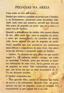 “Herr, Du sagtest mir, dass, nachdem ich beschlossen hätte, Dir zu folgen, Du immer mit mir sein würdest, auf allen meinen Wegen. Aber ich bemerkte, dass während der schlimmsten Gewitterstürme meines Lebens nur ein einziges Paar Fußspuren im Sand zu sehen waren. Ich verstehe nicht, warum Du, in den Zeiten, in den ich Dich am meisten gebraucht hätte, mich allein ließest.” Gott antwortete: